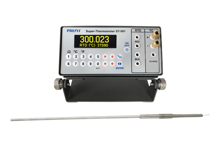The super thermometer ST-501 main purpose is to measure temperature with high accuracy. It uses platinum resistance thermometers sensors and it also accepts standard thermocouples. The digital electronic indicator can be offered complete including the temperature sensor and calibration certificate of the pair. The ST-501 has internal algorithms to calculate the temperature value according to Callendar-Van Dusen (CVD) and ITS-90 among other international temperature tables. For customers that already have one or several RTD’s or PRT’s sensors with quality enough for being used as standards, it is only necessary to enter its respective coefficients. And for those uncalibrated probes, it is possible to use the standard linearization curves for RTDs and thermocouples.